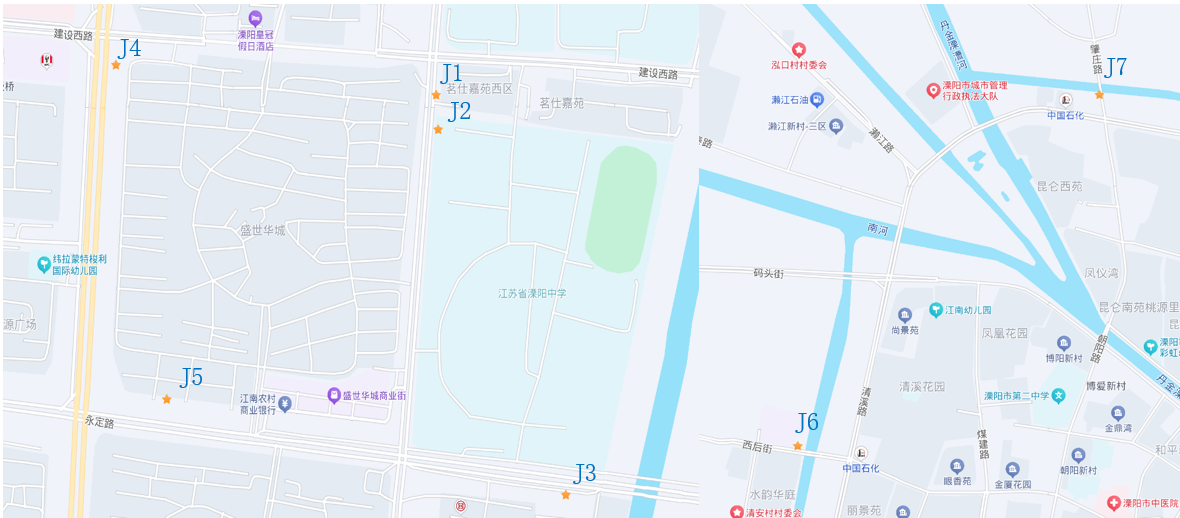 本次工程覆盖多个关键点位,7个截流井(J1-J7)分布在丹金漂漕河、南河周边及建设西路、濑江路等核心区域,包括泓口村村委会附近、溧阳市第二中学周边、清安村村委会周边等人口密集或环境敏感地带,形成了一张全方位的污染防护网。